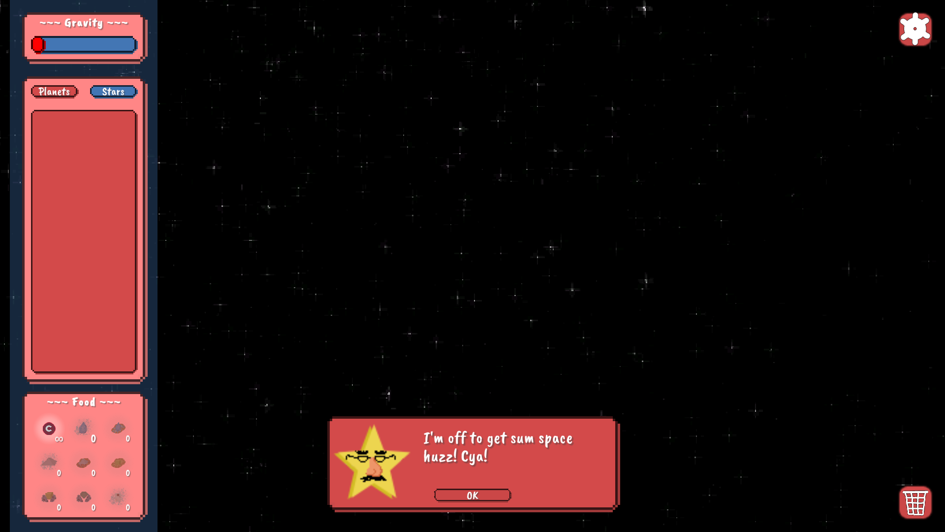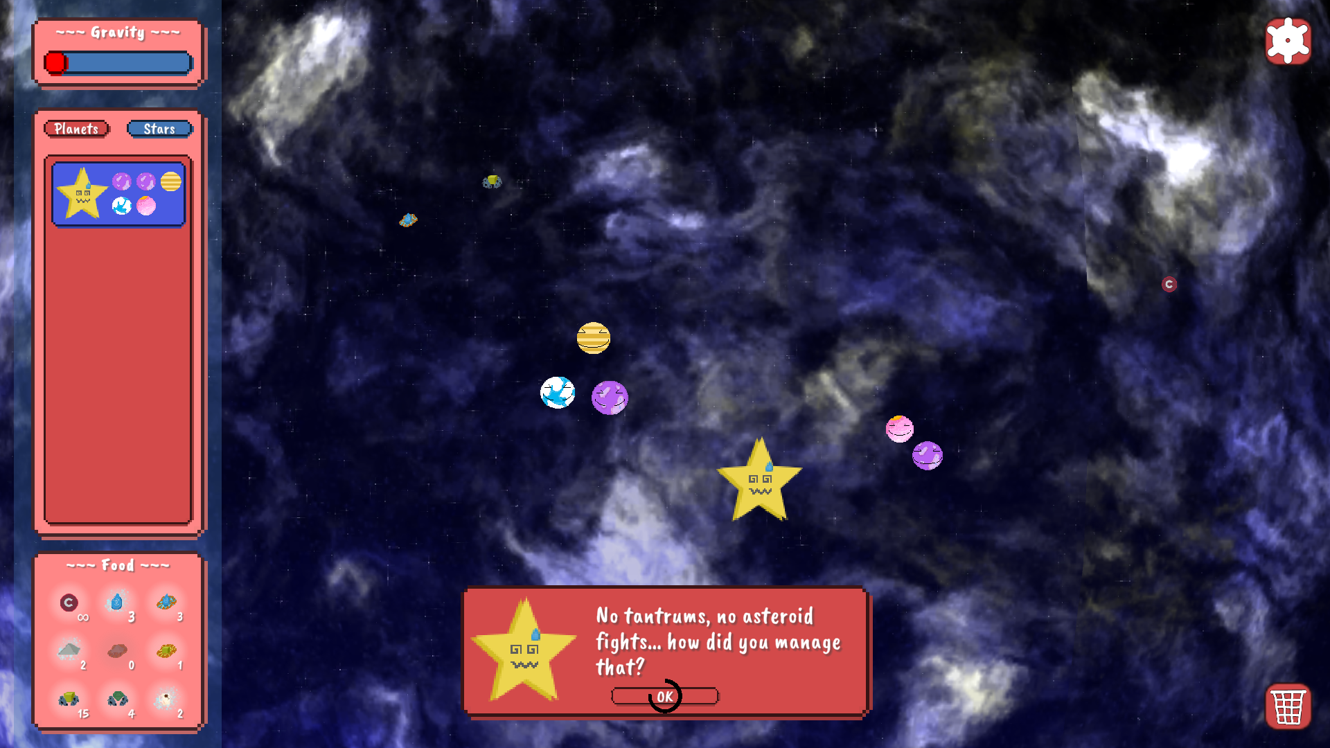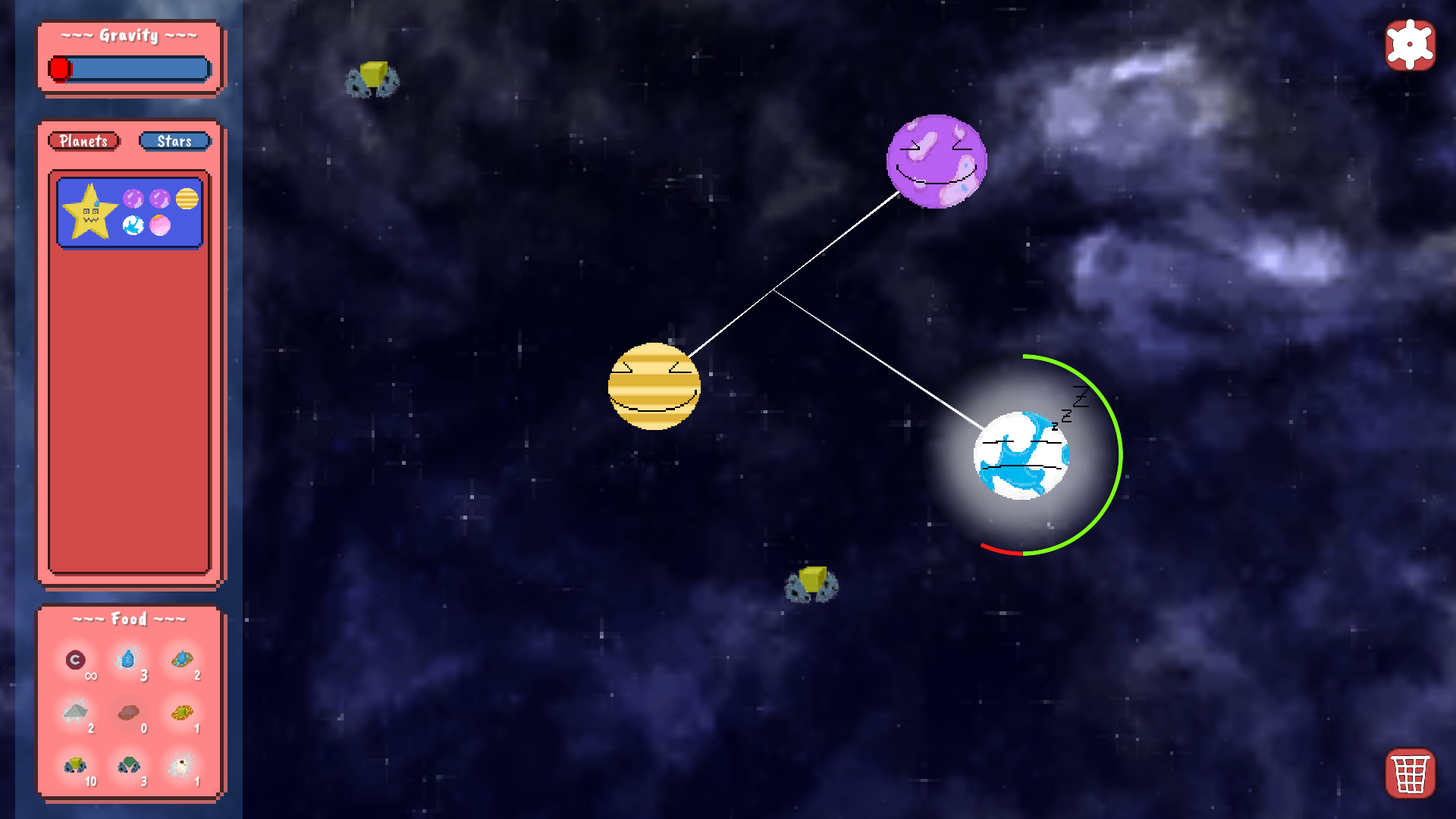 Gameplay is quite simple. You have a whole nebula as your nursery. You're going to want to make sure your planets stay in the bounds of said nursery. Planets will naturally emit resources. Resources are very valuable and are going to want to collect all the resources you can in your nebula. Once they are in your inventory you can combine them with other resources to make food. To keep your planets happy you have to keep feeding them the combined resources from your inventory. Forget to feed to many planets and your nebula will grow red with the planets anger. Once you have successfully taken care of the planets their star will come pick them up! Keep producing happy planets and the stars and your overall company will be happy with your work.